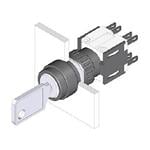 键锁开关 Keylock switch 3 positions, mom-rest-mom, SPE, 2NC+2NO, ST/PT D, 18 gold/silver A 311, 5A 250VAC, 16mm, Mounting Cut-out, solder, IP65